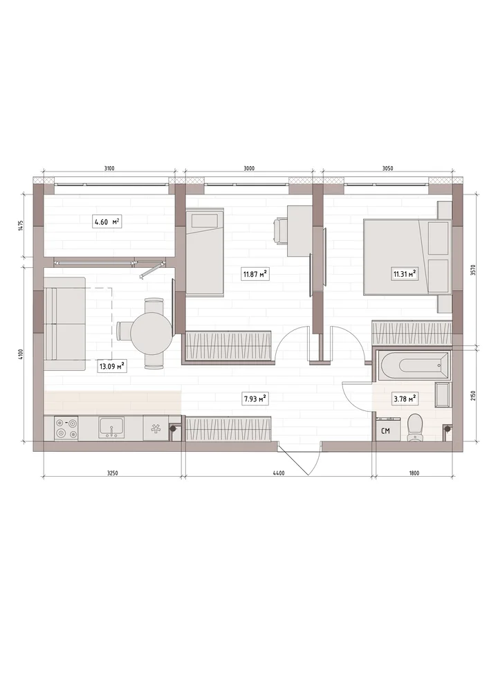 2-комнатная 54.3 м
